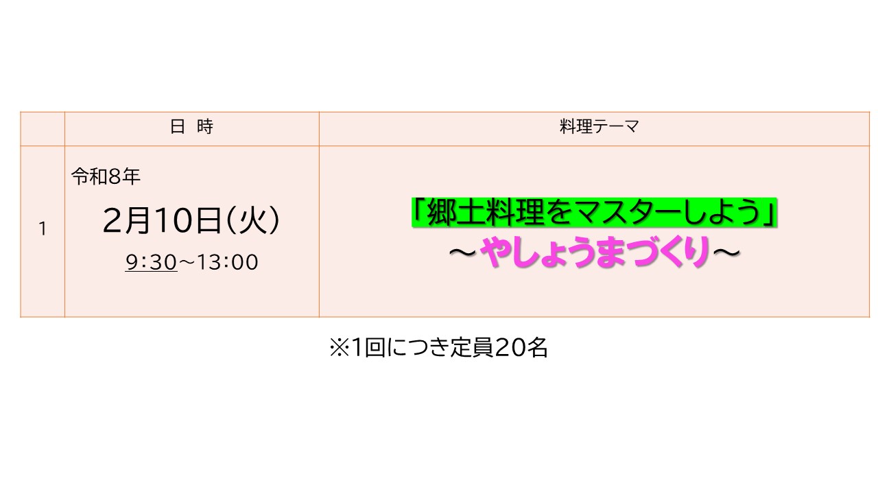 食生活改善推進協議会(通称:食改さん)による、地元野菜等を使った料理や郷土料理の講習会を開催します。参加をご希望される方は健康づくり支援係へ電話で(33‐3116)お申込みいただくか、またはスマホ申請をご利用ください。(下記URLをクリックしてください。)