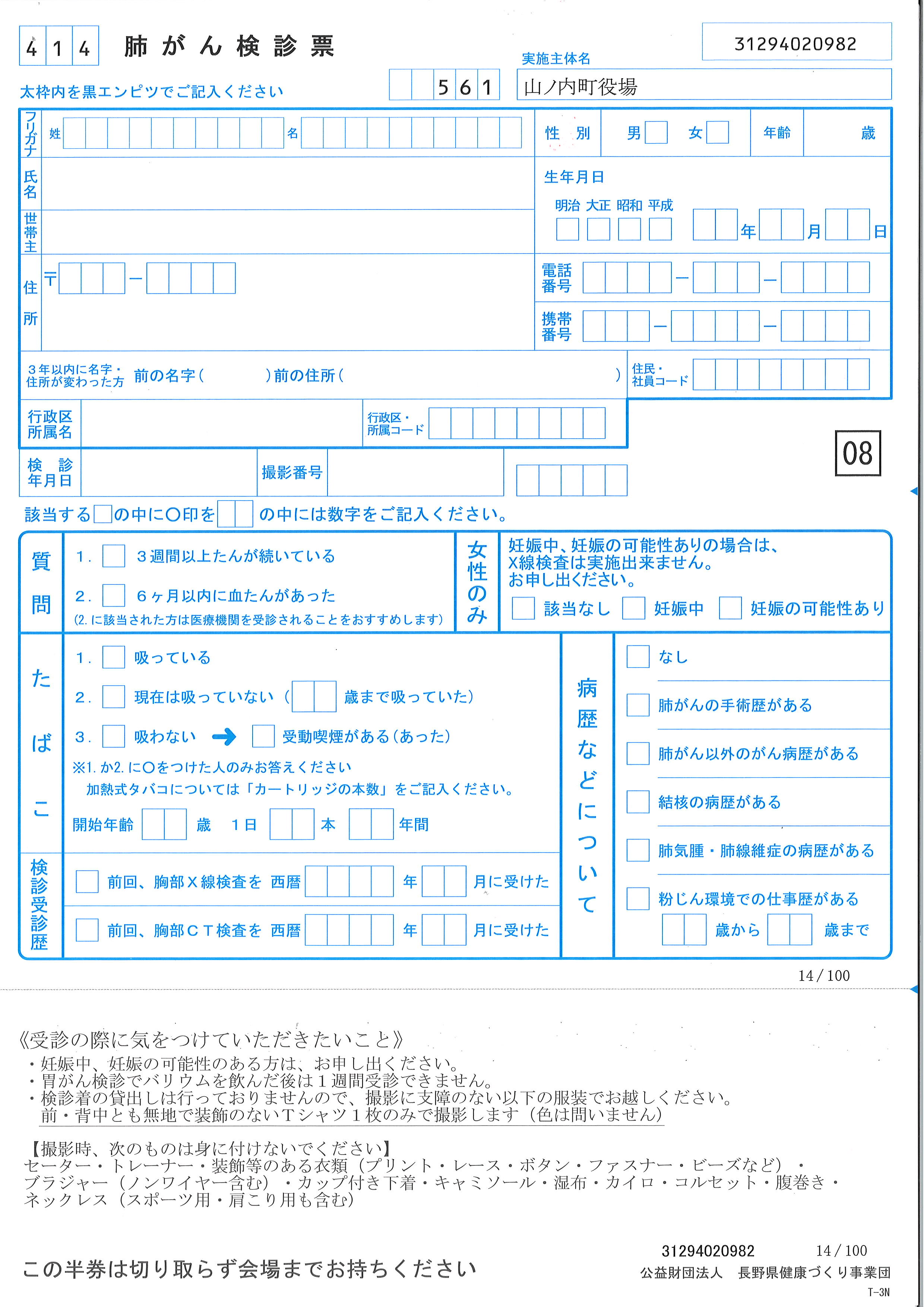 レントゲン検診持ち物:肺がん検診票(見本)、検診料、健康ポイントカード(会場にて随時交付します)