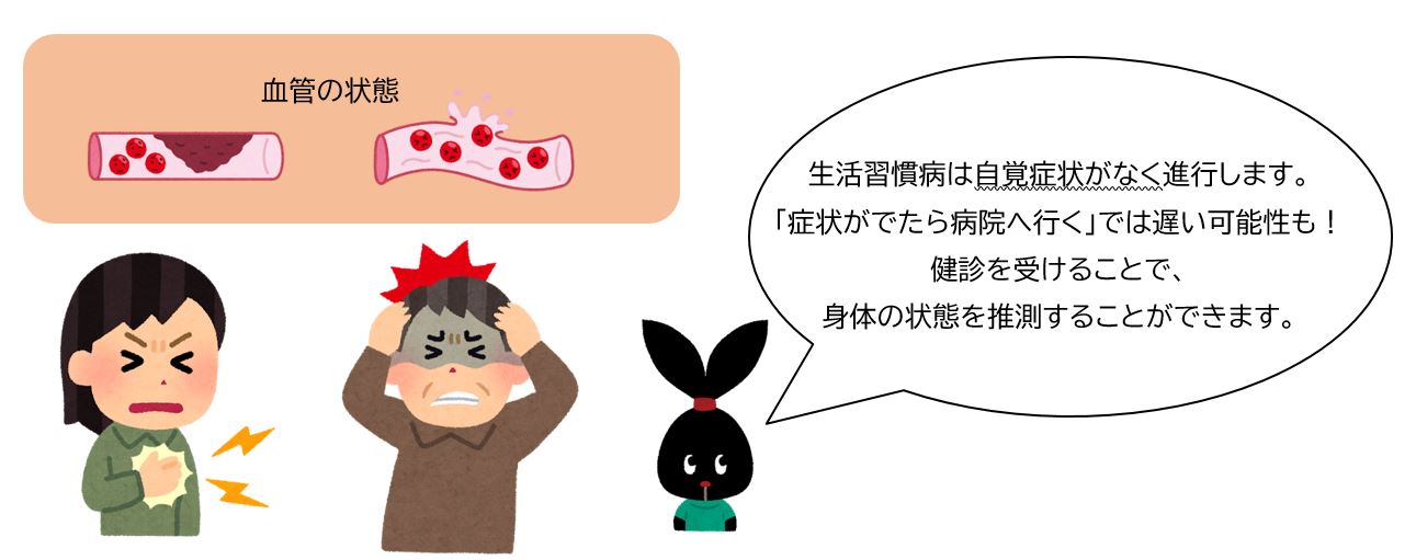 1年に1回は体の状態を詳しく調べ、生活習慣病のリスクを知り改善することで心筋梗塞、脳卒中、腎臓病などの大きな病気を予防することができます。生活習慣病は自覚症状がなく進行し、ある日突然、発症することがあります。