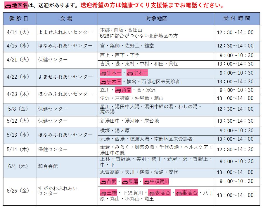 健診料 1200円(山ノ内町国民健康保険加入者の農協組合員 400円)