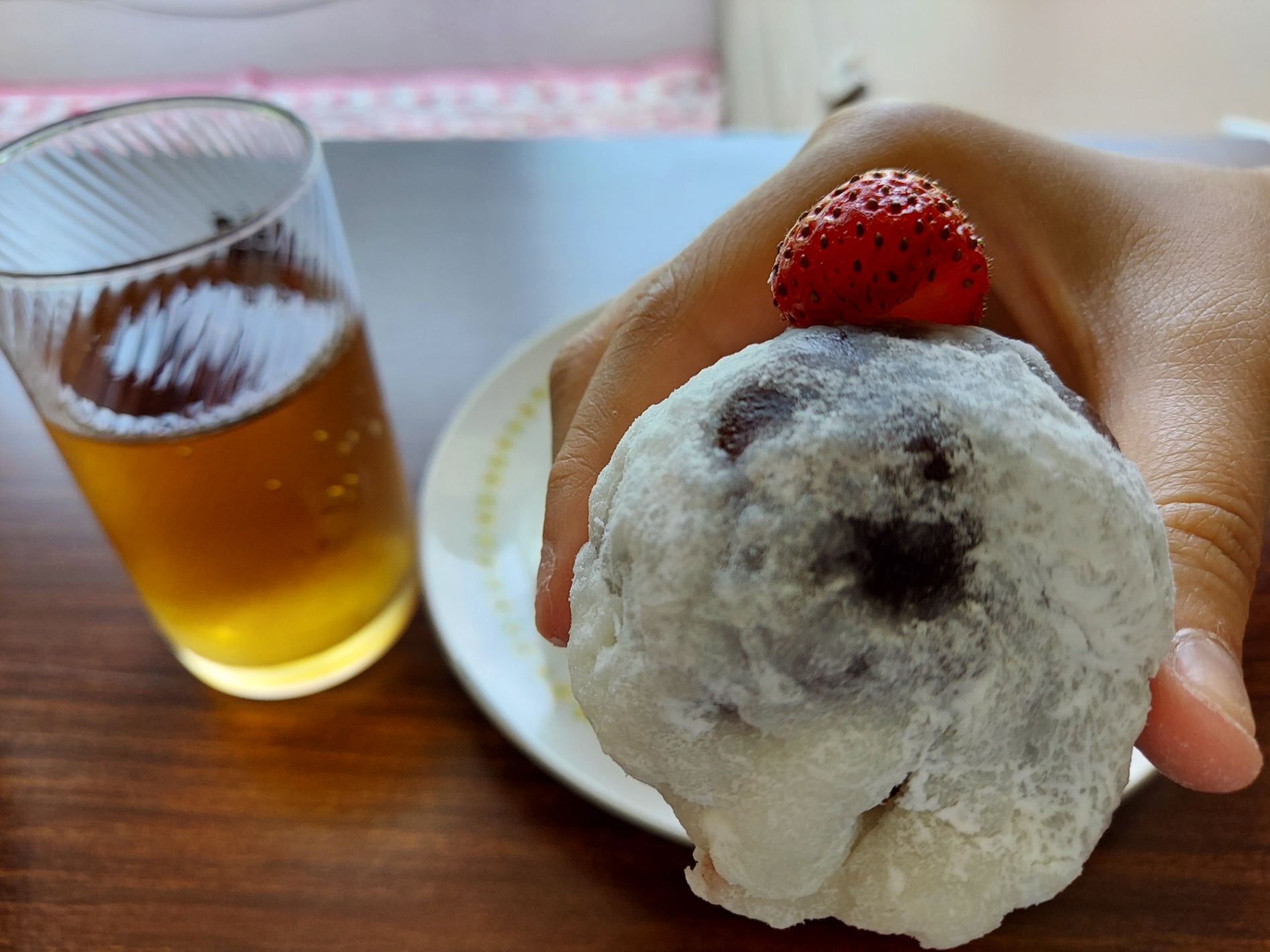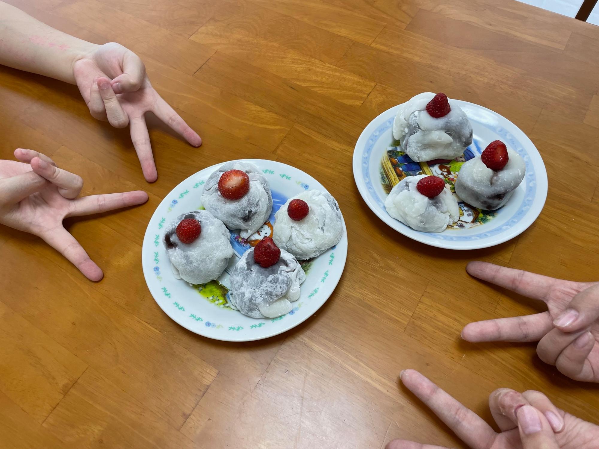 切り餅をレンジでチンして、いちご大福!笑ってる顔みたいにできました。