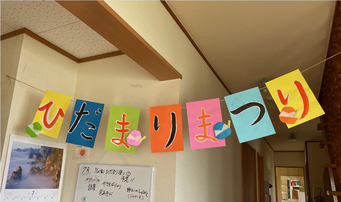 お料理好きな子どもたちとの会話の中からうまれた『ひだまり祭り』。夏といえばお祭り→お祭りといえば焼きそば。「よし!7月はやきそばを作ってひだまり祭りをしよう!」飾りつけも自分たちで行い、かき氷も追加して大満足の『ひだまり祭りPart1』でした。