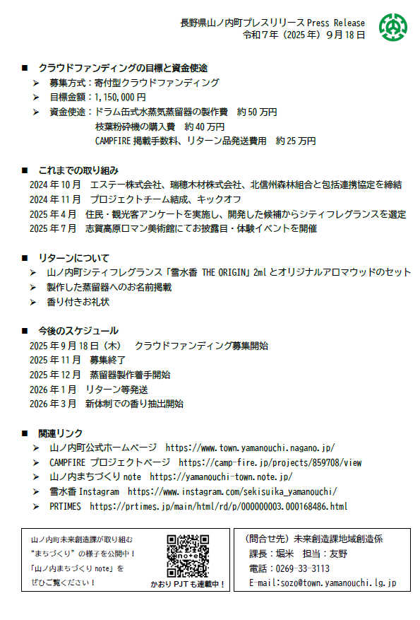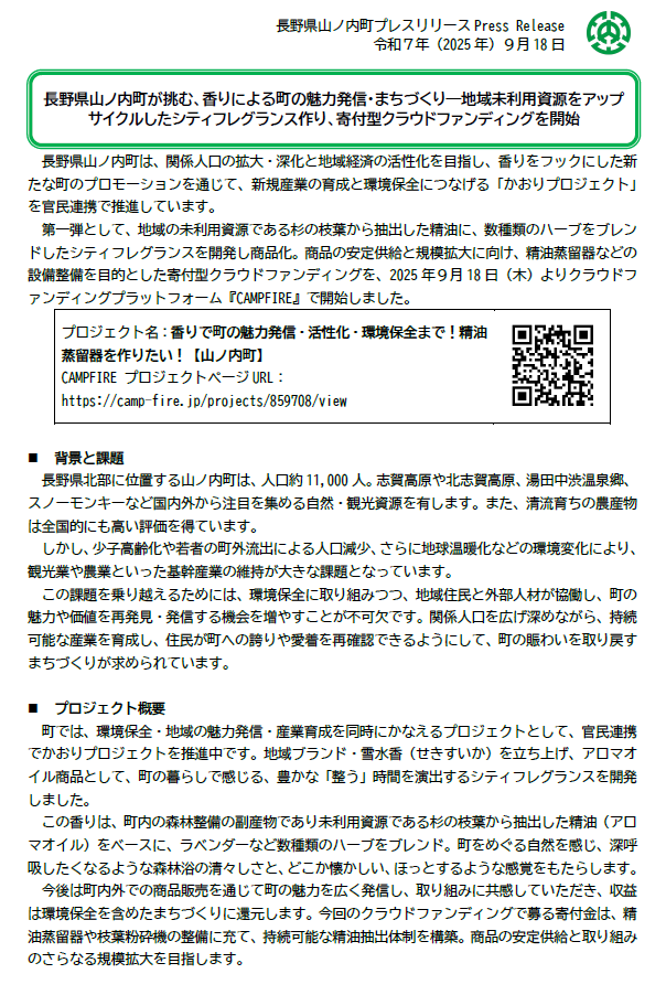 長野県山ノ内町が挑む、香りによる町の魅力発信・まちづくり―地域未利用資源をアップサイクルしたシティフレグランス作り、寄付型クラウドファンディングを開始