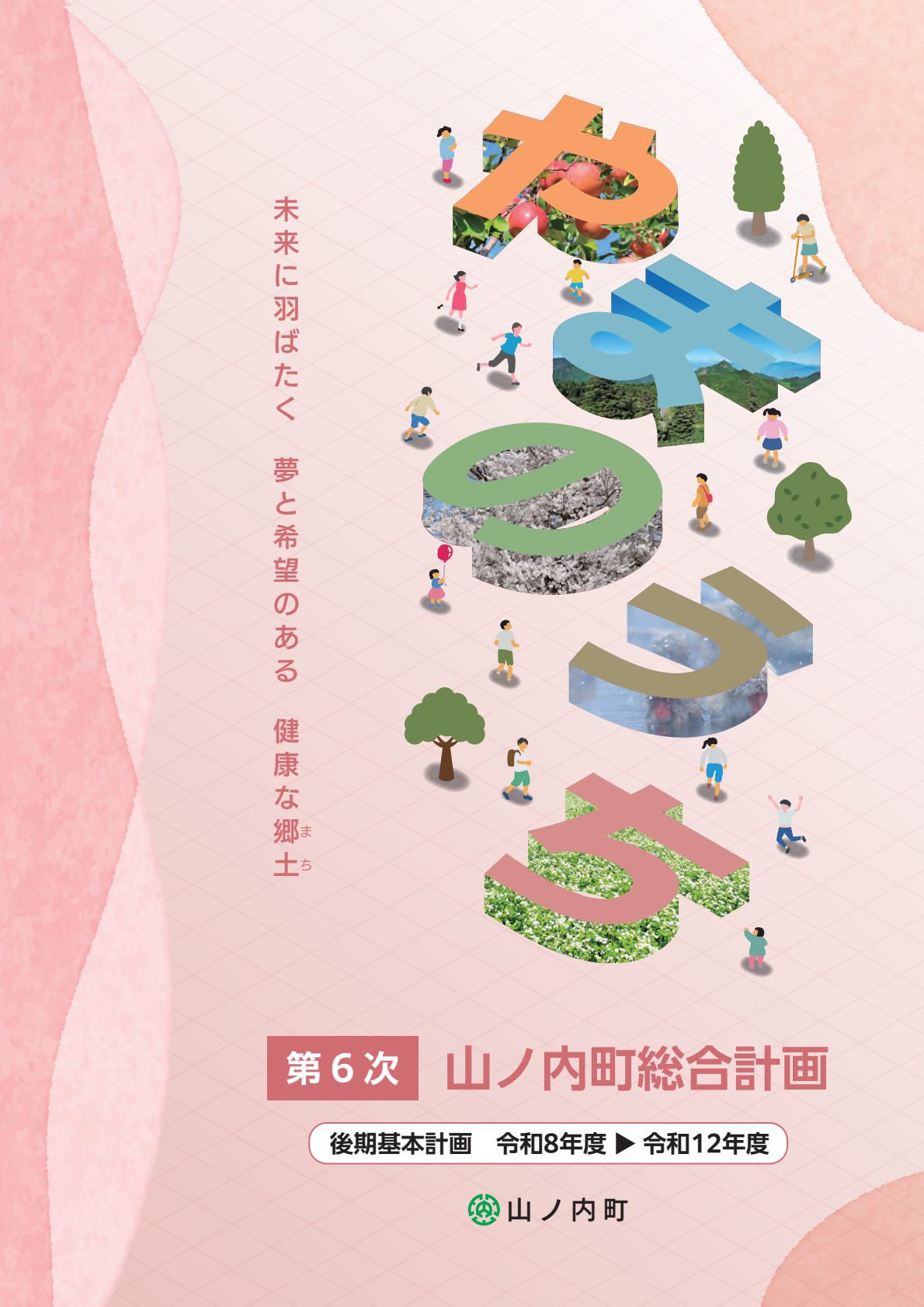第6次山ノ内町総合計画では、「未来に羽ばたく 夢と希望のある 健康な郷土」を将来像に掲げ、未来に羽ばたくこどもたちへ”夢と希望のある郷土”を育むため、町民や企業、行政が互いに絆を大切に、地域の自主性と自立性、独自性を発揮しながら、新しい郷土愛・魅力あふれる”健康な郷土”の更なる創造を目指します。