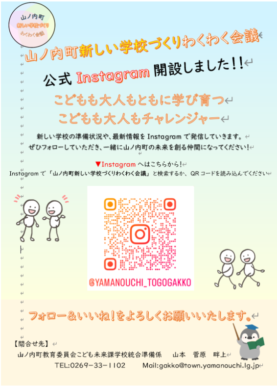 山ノ内町の新しい学校づくりに関する最新情報をお届けするため、【公式】Instagramのページを開設しましたので、ぜひフォローをお願いします。