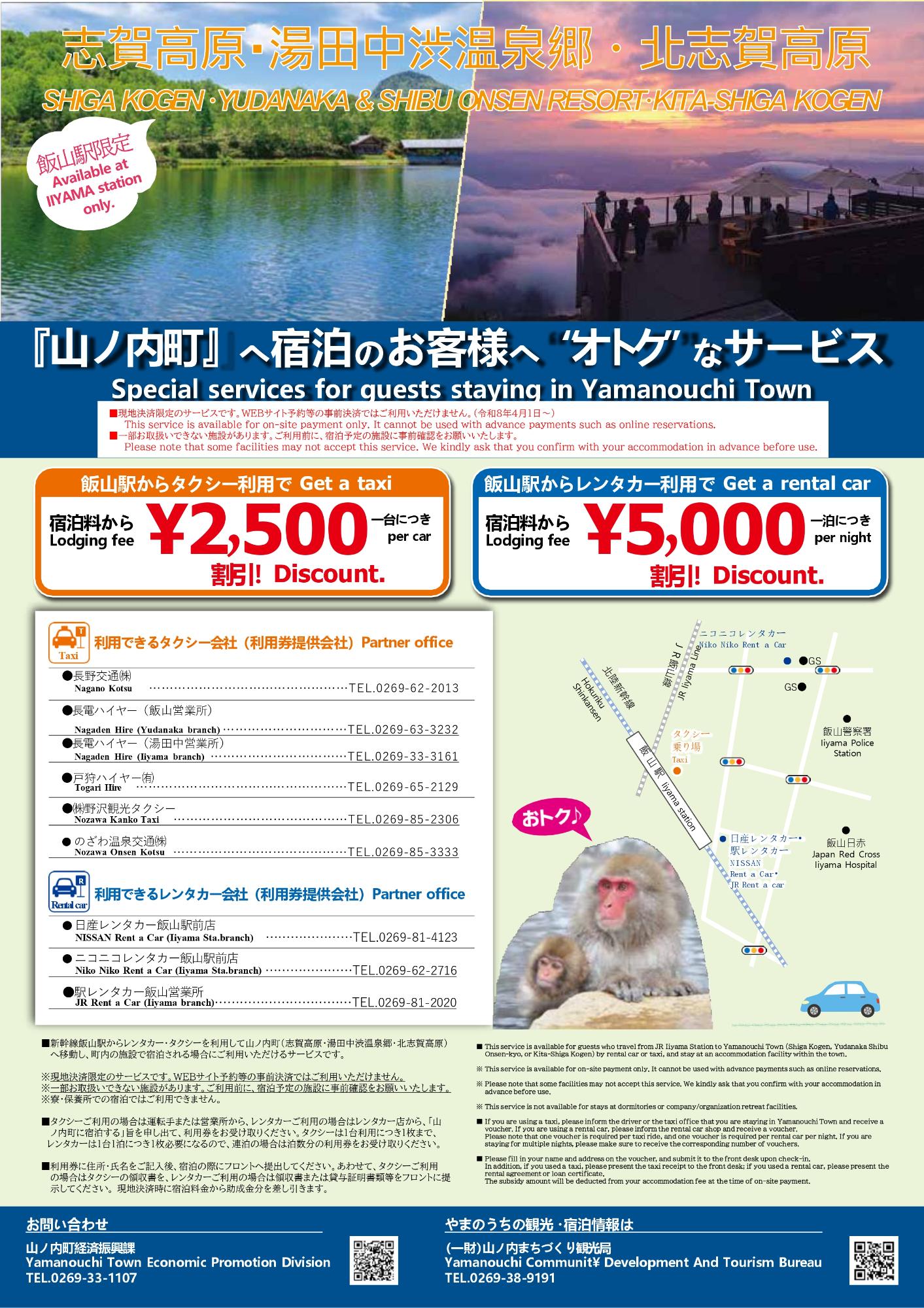 令和6年4月より精算窓口が「山ノ内まちづくり観光局」(湯田中駅構内)に変更となっております。助成分の請求につきましては、請求書及び利用券を観光局までご提出ください。※年度末に大量に請求されますと、予算の都合からお支払いが利用月の翌々月になる場合がございますのでご了承ください。