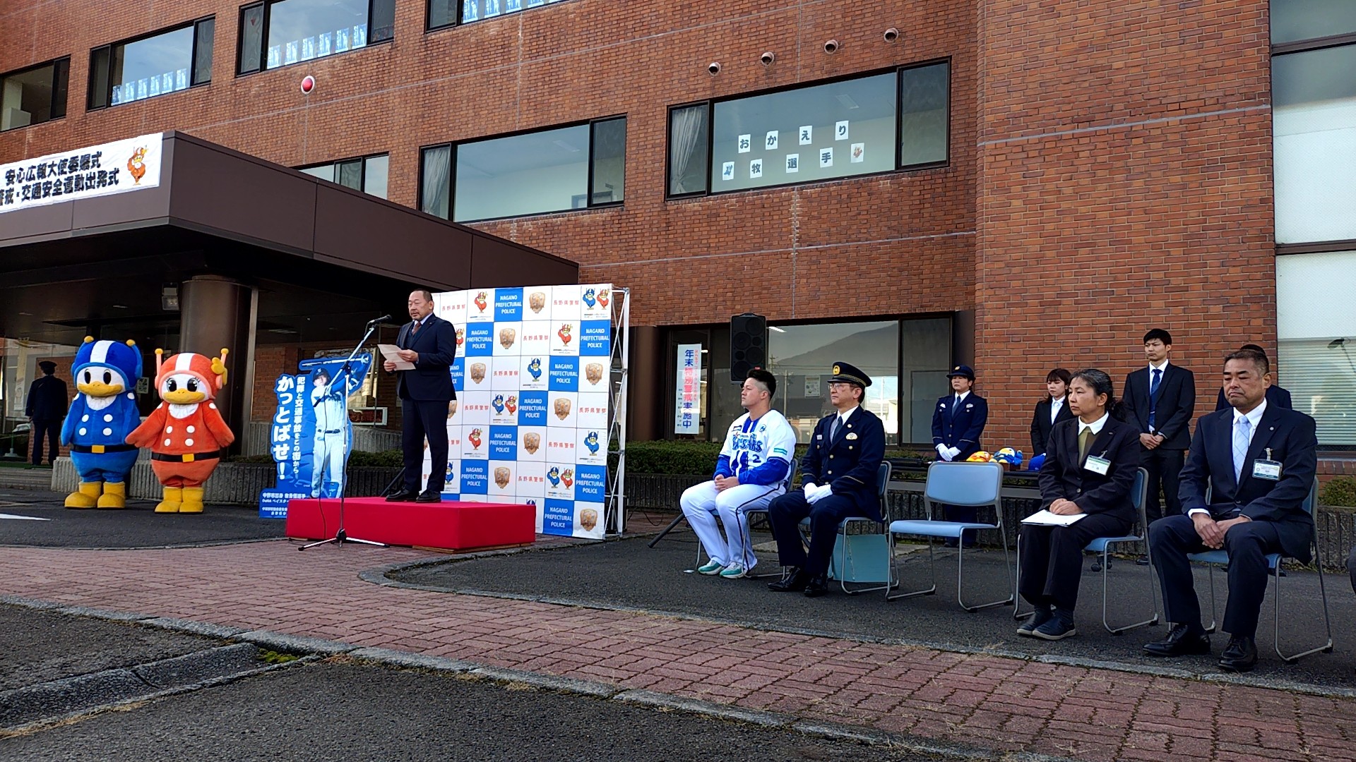 年末特別警戒・年末の交通安全運動の合同出発式が12月2日、地元中野市出身でプロ野球・横浜DeNAベイスターズで活躍中の牧秀悟選手が犯罪防止や交通安全を呼びかける「安全・安心広報大使」に委嘱されました。セレモニーには関係機関や協力団体をはじめ地元小学生など大勢参加。