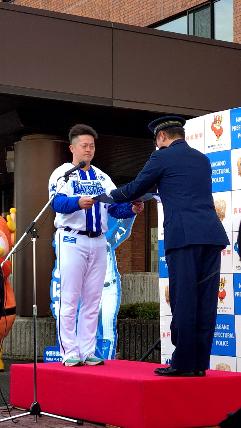 セレモニーは山ノ内町平澤町長と長野県北信地域振興局三森局長からのあいさつから始まり、中野警察署橋本署長から牧選手に委嘱状が手渡され、出発の号令と共に参加者全員で「デスターシャ!」のポーズで街の安心安全が維持できるよう思いを新たにしました!